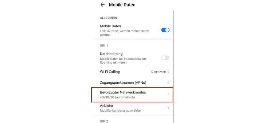 Je nach Aufenthaltsort sind unterschiedliche Netzwerktypen verfügbar. Stell den schnellsten Netzwerktypen ein, damit Dein Handy immer das Netz mit der schnellsten Daten-Geschwindigkeit und dem besten Empfang findet.