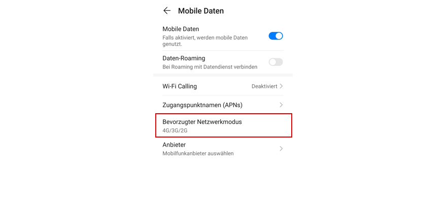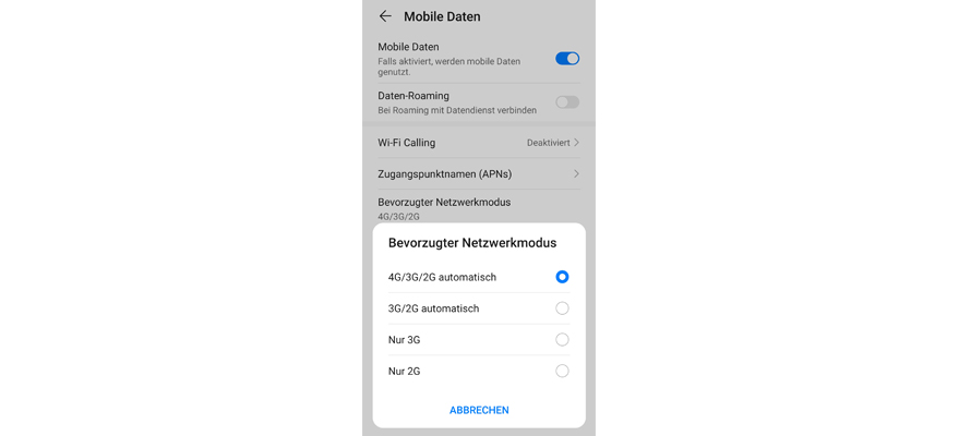 Je nach Aufenthaltsort sind unterschiedliche Netzwerktypen verfügbar. Stell den schnellsten Netzwerktypen ein, damit Dein Handy immer das Netz mit der schnellsten Daten-Geschwindigkeit und dem besten Empfang findet.