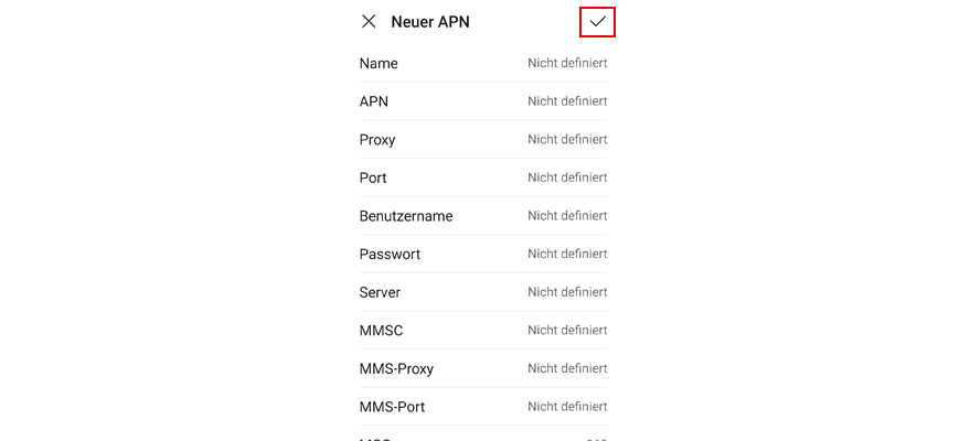 Tipp auf das Häkchen, um den neuen Zugangspunkt (APN) zu speichern.