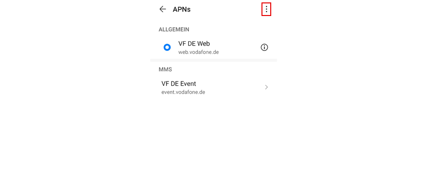 Name: Vodafone Internet APN: web.vodafone.de Proxy: Nicht definiert Port: Nicht definiert Benutzername: Nicht definiert Passwort: Nicht definiert Server: Nicht definiert MMSC: Nicht definiert MMS-Proxy: Nicht definiert MMS-Port: Nicht definiert MCC: 262 MNC: 02 Authentifizierungstyp: Ohne APN-Typ:default,supl,xcap APN-Protokoll: IPv4 APN-Roaming-Protokoll: IPv4 Übertragungsart: Nicht angegeben Typ des virtuellen Mobilfunknetzbetreibers: Keiner