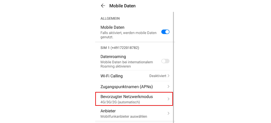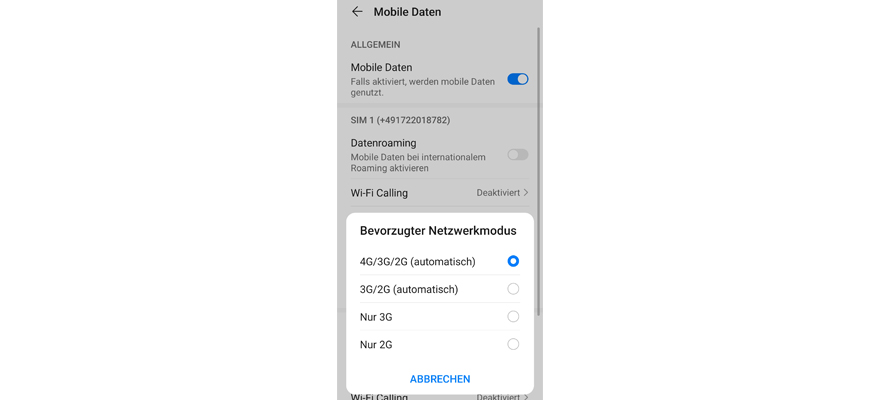 Je nach Aufenthaltsort sind unterschiedliche Netzwerktypen verfügbar. Stell den schnellsten Netzwerktypen ein, damit Dein Handy immer das Netz mit der schnellsten Daten-Geschwindigkeit und dem besten Empfang findet.