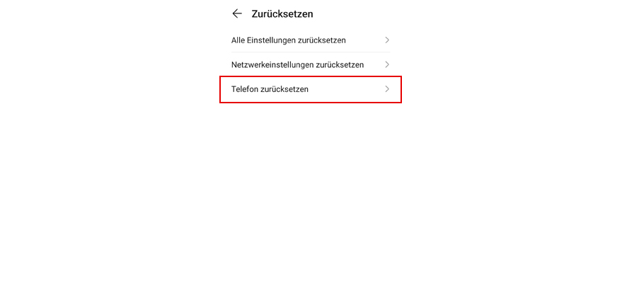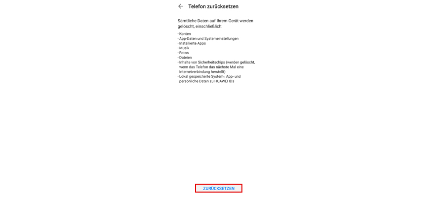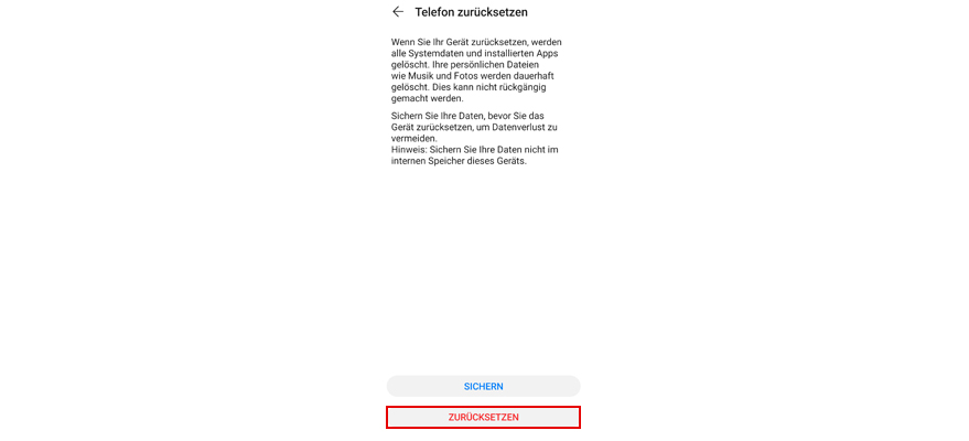 Wähl Zurücksetzen. Hinweis: Alle Daten werden aus dem Telefonspeicher gelöscht.