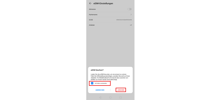 Tipp auf den Schieberegler neben Aktivieren, um die eSIM zu deaktivieren.