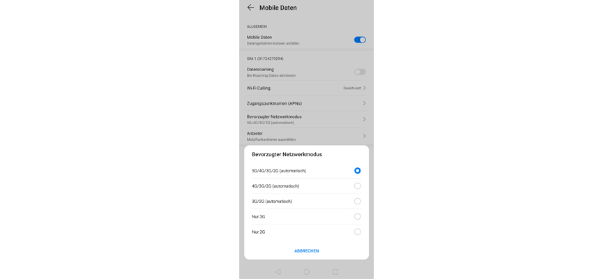 Je nach Aufenthaltsort sind unterschiedliche Netzwerktypen verfügbar. Stell den schnellsten Netzwerktypen ein, damit Dein Handy immer das Netz mit der schnellsten Daten-Geschwindigkeit und dem besten Empfang findet.