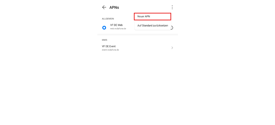 Tipp auf das Menü-Symbol, um einen neuen APN hinzuzufügen.