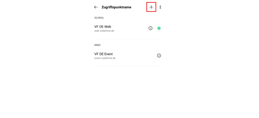 Tipp auf das +-Symbol, um einen neuen APN hinzuzufügen.