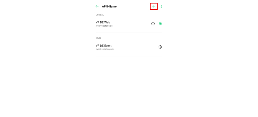 Tipp auf das +-Symbol, um einen neuen APN hinzuzufügen.