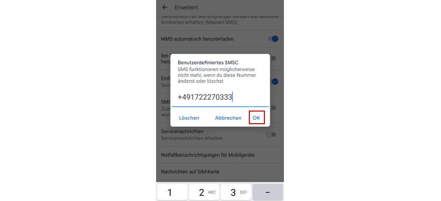 Wähl Benutzerdefiniertes SMSC.