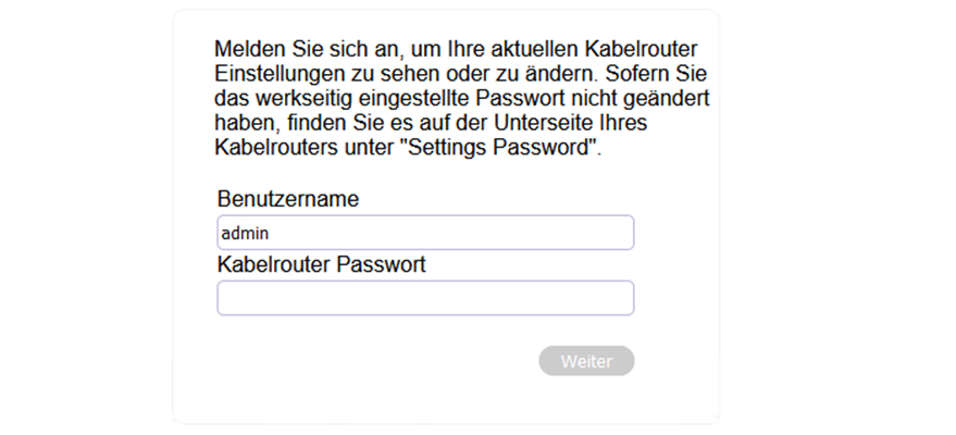 - Die Anmeldeseite zur Benutzeroberfläche Deines Kabel-Routers öffnet sich. Beim Benutzername steht admin. Gib beim Feld Kabelrouter Passwort Dein Passwort ein und wähl dann Weiter.