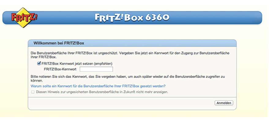 - Vergib ein Passwort für die Benutzeroberfläche. Oder entfern das Häkchen aus der Check-Box FRITZ!Box Kennwort jetzt setzen und klick auf Anmelden. Wenn Du ein Passwort für die FRITZ!Box Benutzeroberfläche vergeben hast, gib es bitte ein.