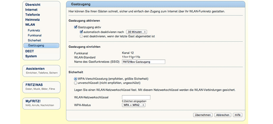 - Aktiviere die WPA-Verschlüsselung. Trag einen WLAN-Netzwerkschlüssel für den WLAN-Gastzugang ein. Speicher die Einstellungen mit Übernehmen. Gut zu wissen: Für optimale Sicherheit sollte der WLAN-Netzwerkschlüssel aus mindestens 16 Zeichen bestehen. Nutz neben Ziffern und Buchstaben auch andere Zeichen und nutz Groß- und Kleinschreibung.