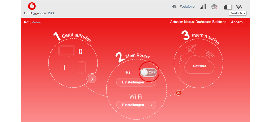- Trenn zuerst die Verbindung über den Schieberegler von ON auf OFF auf der GigaCube-Web-Oberfläche. Die Verbindung wird getrennt.