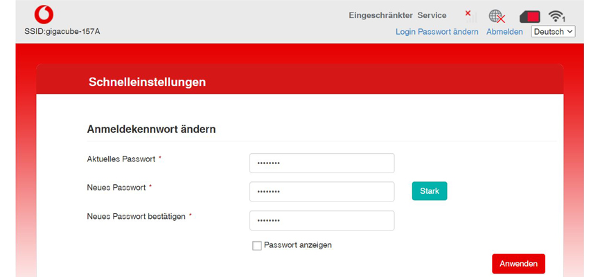 - Wähl über die GigaCube-Web-Oberfläche Login Passwort ändern.