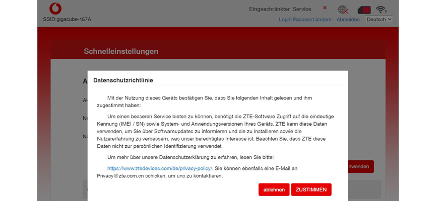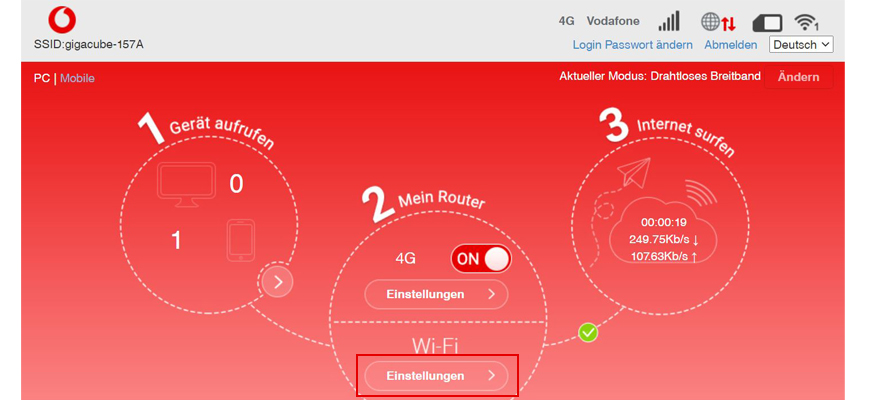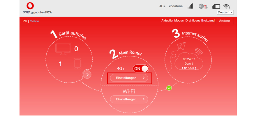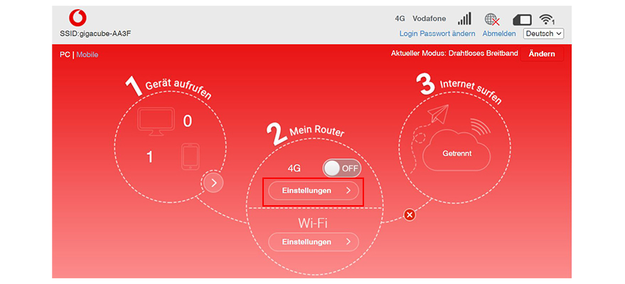 - Im Vodafone Center unter center.vodafone.de. Wichtig: Die Seite lässt sich nur öffnen, wenn Du über den GigaCube im Internet surfst.