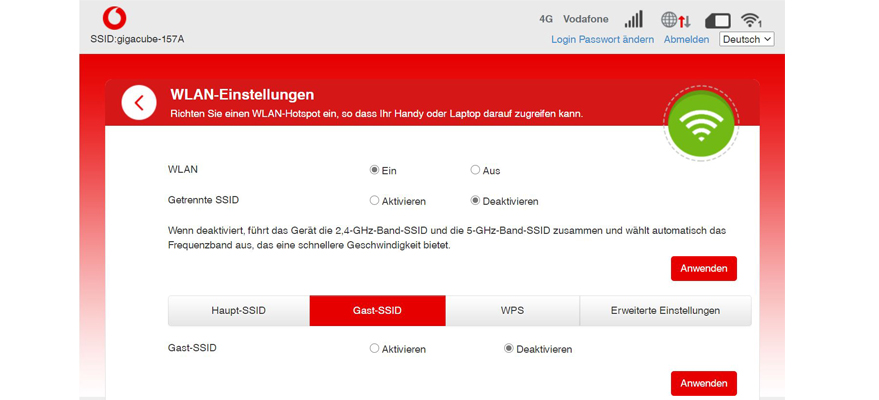 - Klick auf Anwenden. Beachte: Das WLAN-Passwort ist nicht das Login-Passwort.