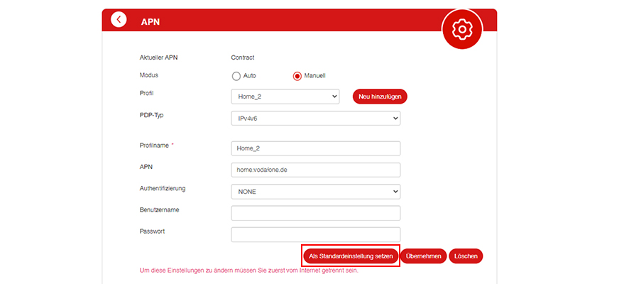 - Gib den Profilnamen ein, z.B. Home_2. Gib bei APN home.vodafone.de ein.