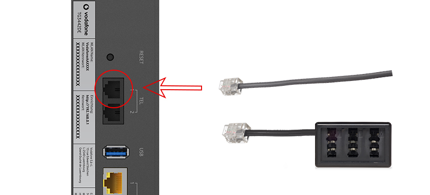 - Steck den Stecker Deines Telefons in den Anschluss TEL 1 Deiner Vodafone Station. Passt der Stecker nicht? Dann nutz den RJ11-TAE-Adapter.