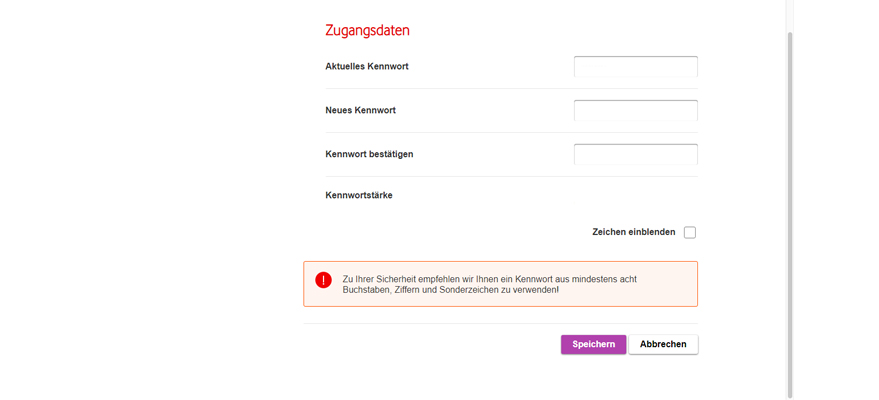 - Unter Neues Kennwort gib Dein neues Kennwort ein (mind. 8 Zeichen ohne Umlaute oder Sonderzeichen).