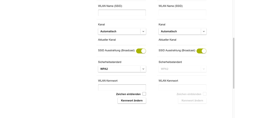 - Scroll nach unten. Gib unter WLAN-Name (SSID) den Namen Deines Funknetzes (Netzwerknamen) ein. Wichtig: Sonderzeichen (z.B. ä, ö, ü, ß) werden von einigen WLAN-Geräten (z.B. Apple iPhone) nicht unterstützt.