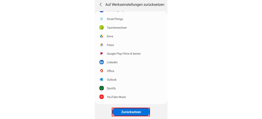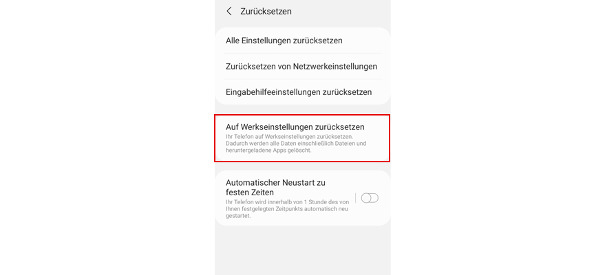 Tipp auf Zurücksetzen. Hinweis: Alle Daten werden aus dem Telefonspeicher gelöscht.