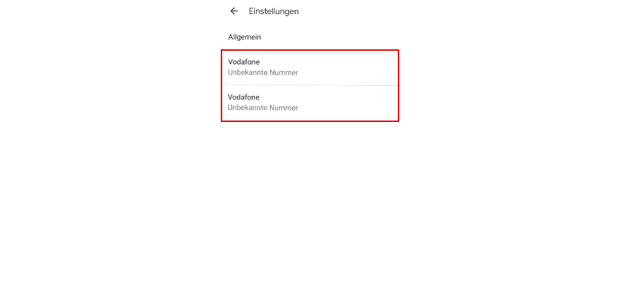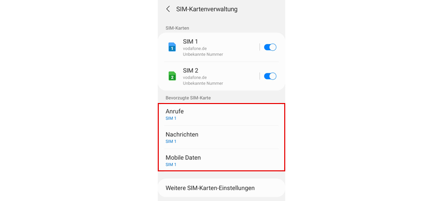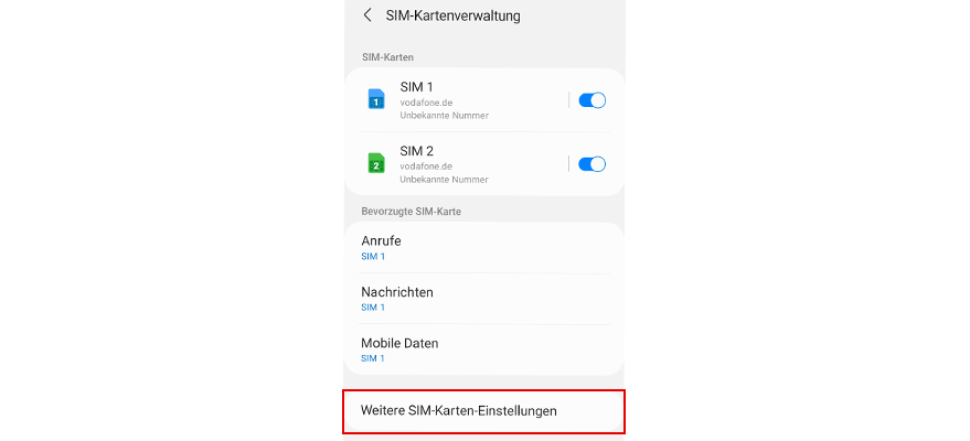 Wähl SIM 1 und SIM 2. In unserem Beispiel heißen die SIM-Karten Vodafone.