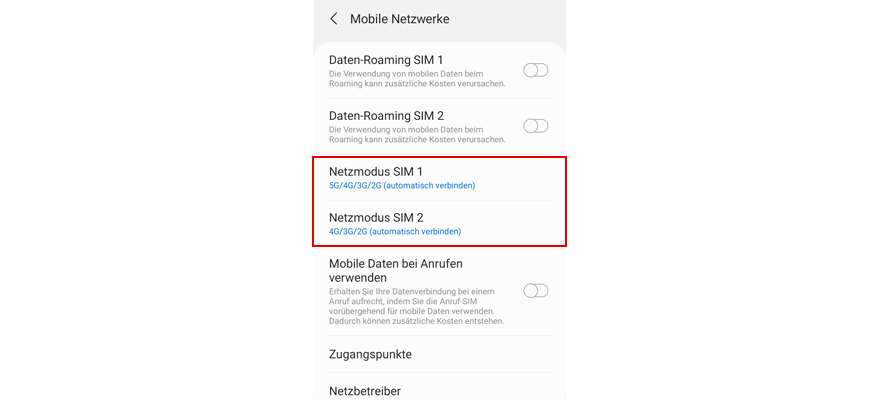 Nutzt Du 2 SIM-Karten, dann kannst Du den Netzmodus für beide SIM-Karten auswählen.