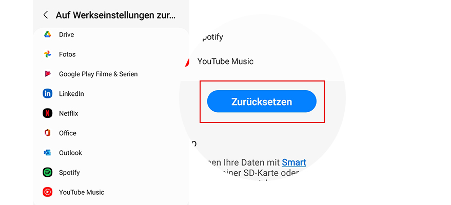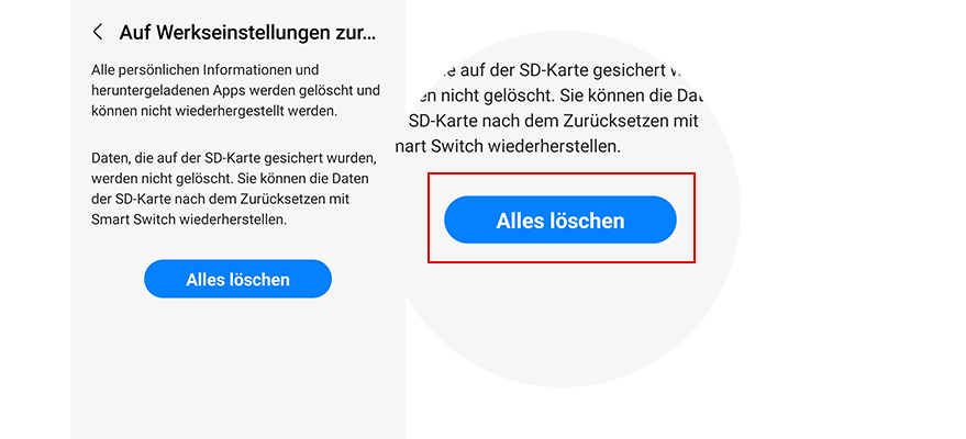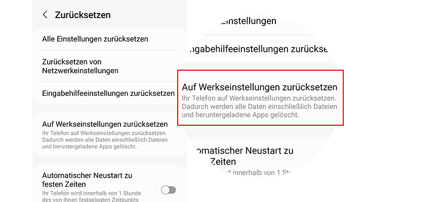 - Wähl Zurücksetzen. Gut zu wissen: Alle Daten werden aus Deinem Telefonspeicher gelöscht. Tipp: Sicher vorher Deine Daten, damit Dir z.B. keine Kontakte verloren gehen.