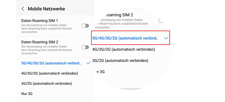 Je nach Aufenthaltsort sind unterschiedliche Netzmodi verfügbar. Stell den schnellsten Netzmodus ein, damit Dein Smartphone immer das Netz mit der schnellsten Daten-Geschwindigkeit und dem besten Empfang findet.