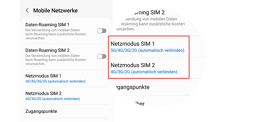 - Wähl Netzmodus. Gut zu wissen: Nutzt Du mehrere SIM-Karten, siehst Du Netzmodus SIM 1 und Netzmodus SIM 2.