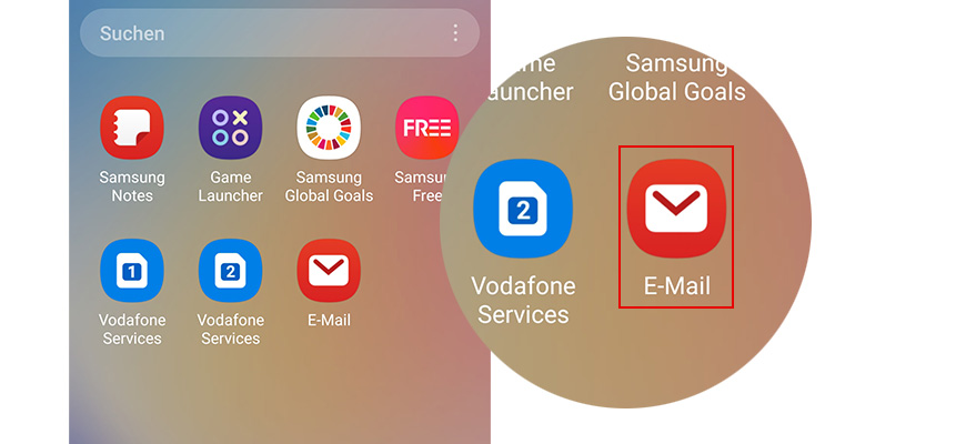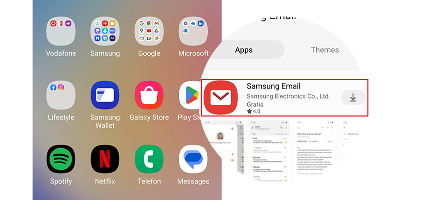 - Öffne den Galaxy Store. Such über die Lupe oben rechts nach Samsung Email. Lad die App Samsung Email herunter.
