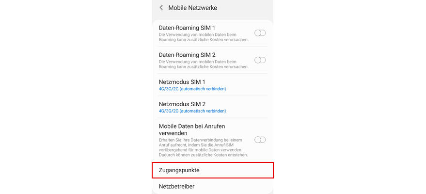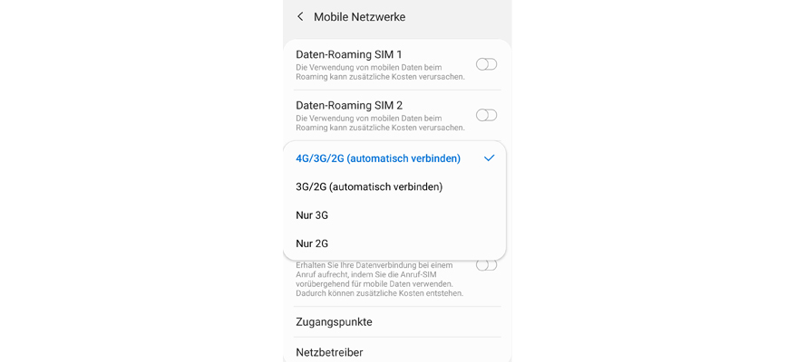 Wähl Netzmodus SIM 1 oder Netzmodus SIM 2, um den Netzmodus auszuwählen.