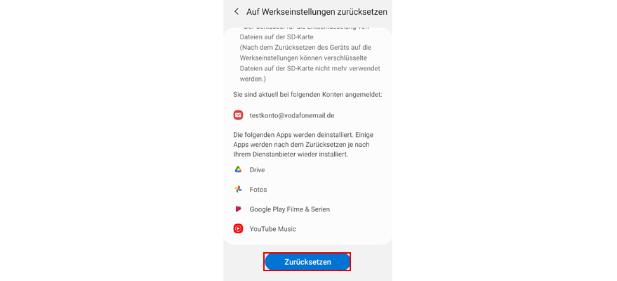 Wähl Zurücksetzen. Hinweis: Alle Daten werden aus dem Telefonspeicher gelöscht.