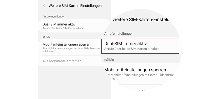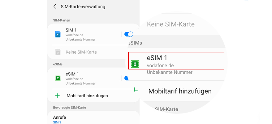 Unter Bevorzugte SIM-Karten wähl die SIM-Karte für Anrufe, SMS und Mobile Daten aus.
