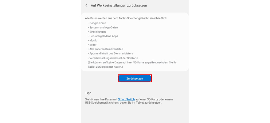 Wähl Zurücksetzen. Hinweis: Alle Daten werden aus dem Telefonspeicher gelöscht.