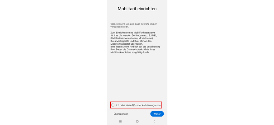 Falls Du Deine eSIM auf Deiner Smartwatch einrichten möchtest, wähl Ich habe einen QR- oder Aktivierungscode und Weiter. Folg anschließend den Anweisungen.