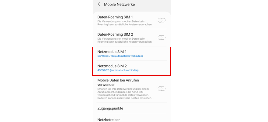 Je nach Aufenthaltsort sind unterschiedliche Netzwerktypen verfügbar. Stell den schnellsten Netzwerktypen ein, damit Dein Handy immer das Netz mit der schnellsten Daten-Geschwindigkeit und dem besten Empfang findet.
