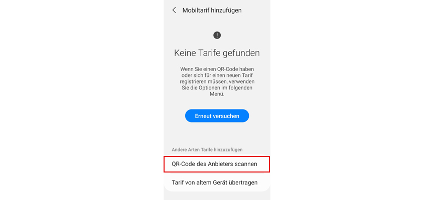 Hast Du einen QR-Code oder möchtest Dich für einen neuen Tarif registrieren, dann nutz die Optionen QR-Code des Anbieters scannen.