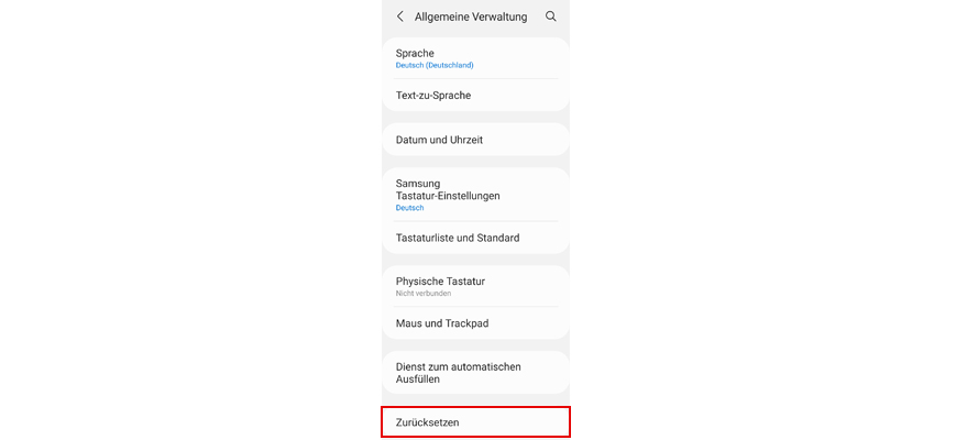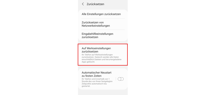 Wähl Zurücksetzen. Hinweis: Alle Daten werden aus dem Telefonspeicher gelöscht. Tipp: Sicher vorher Deine Daten, damit Dir z.B. keine Kontakte verloren gehen.