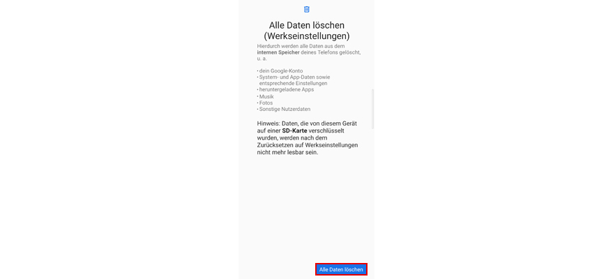 Wähl Alle Daten löschen. Hinweis: Alle Daten werden aus dem Telefonspeicher gelöscht.