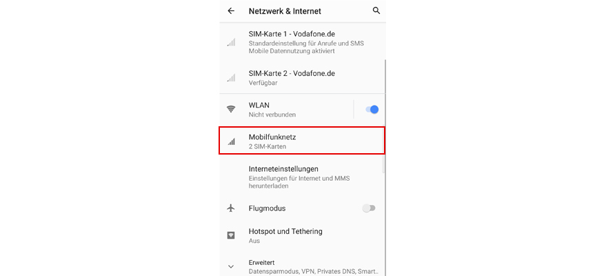 Name: Vodafone Internet APN: web.vodafone.de Proxy: Nicht definiert Port: Nicht definiert Nutzername: Nicht definiert Passwort: Nicht definiert Server: Nicht definiert MMSC: Nicht definiert MMS-Proxy: Nicht definiert MMS-Port: Nicht definiert MCC: 262 MNC: 02 Authentifizierungstyp: Ohne APN-Typ:default,supl,xcap APN-Protokoll: IPv4 APN-Roaming-Protokoll: IPv4 Übertragungsart: Nicht definiert Typ des virtuellen Mobilfunknetzbetreibers: Keiner