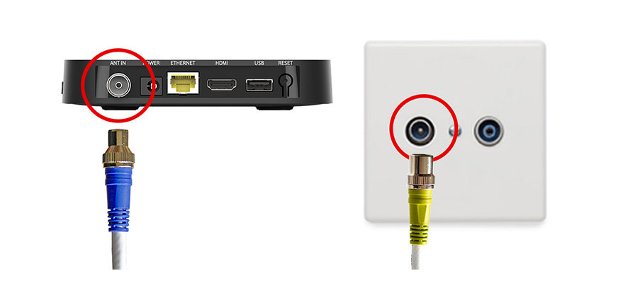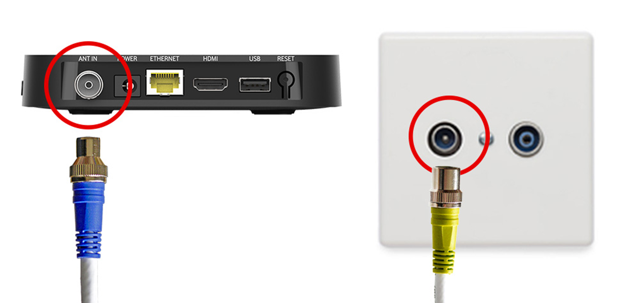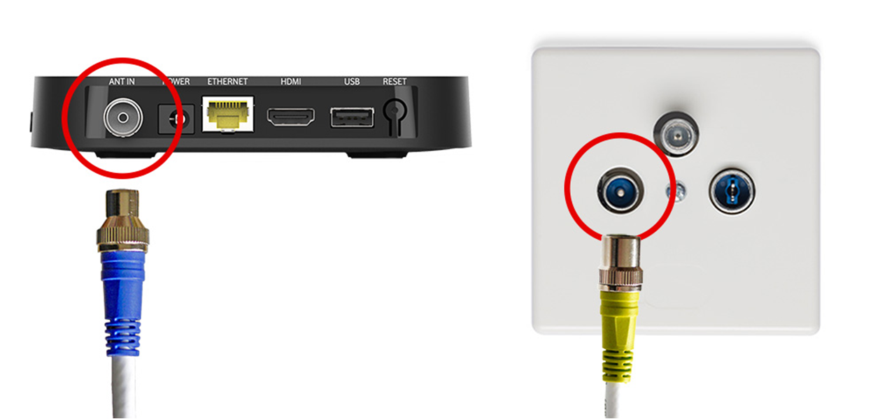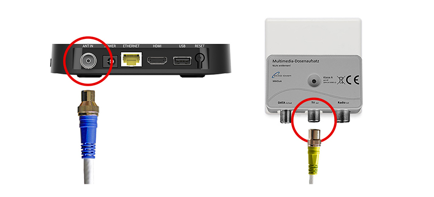 - Verbinde des Antennenkabel: Steck das trichterförmige blaue Ende des Kabels in den Kabel-TV-Eingang ANT IN Deiner GigaTV Home oder GigaTV Home Sound. Steck das runde gelbe Ende in den TV-Anschluss Deiner Kabel-Dose.