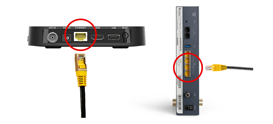 - Verbinde Deine GigaTV Home oder GigaTV Home Sound mit dem Internet: Steck das eine Ende des LAN-Kabels in den ETHERNET-Anschluss Deiner GigaTV Home oder GigaTV Home Sound. Steck das andere Ende in Deinen Router. Du kannst dafür einen von 4 LAN-Anschlüssen auf der Rückseite Deines Routers benutzen. Gut zu wissen: Dazu muss Dein Router mit dem Internet verbunden sein.