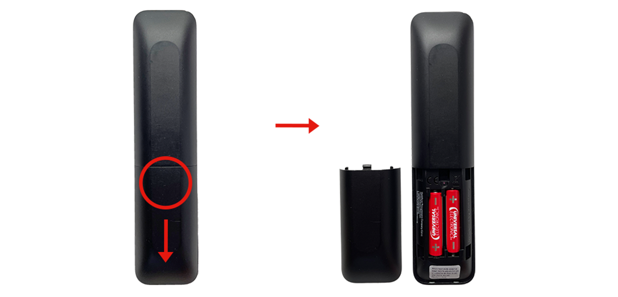 Öffne das Batteriefach auf der Rückseite Deiner Fernbedienung. Drück dafür die Abdeckung nach unten und schieb sie raus. Steck dann die Batterien ein – Du findest sie in einem kleinen weißen Pappkarton.