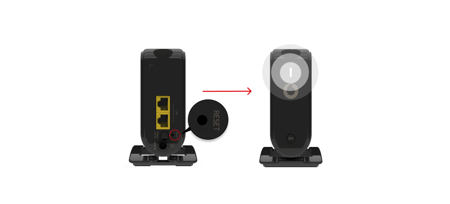 - Halt die Reset-Taste auf der Rückseite mit einem kleinen, spitzen Gegenstand für 10 Sekunden lang gedrückt, bis die LED weiß zu blinken beginnt. Der Reset-Vorgang startet. Dies kann bis zu 3 Minuten dauern.