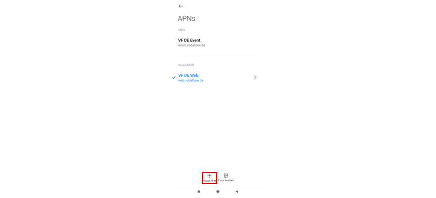 Tipp auf das Plus-Symbol / Neuer APN, um einen neuen APN hinzuzufügen.