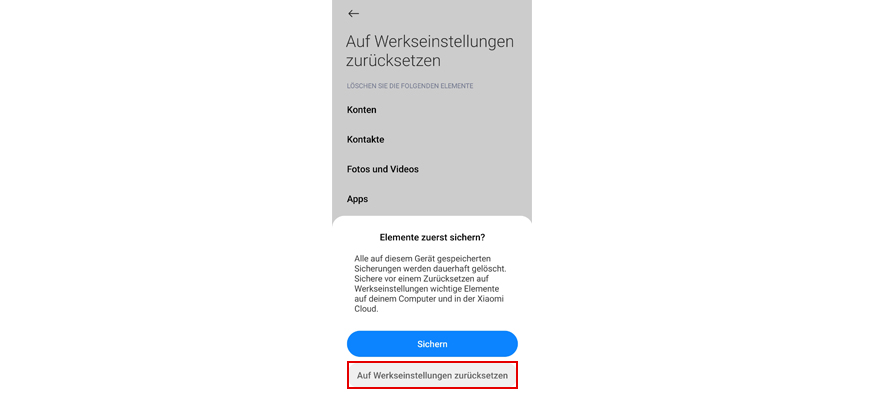 Wähl Auf Werkseinstellungen zurücksetzen. Hinweis: Alle Daten werden aus dem Telefonspeicher gelöscht.