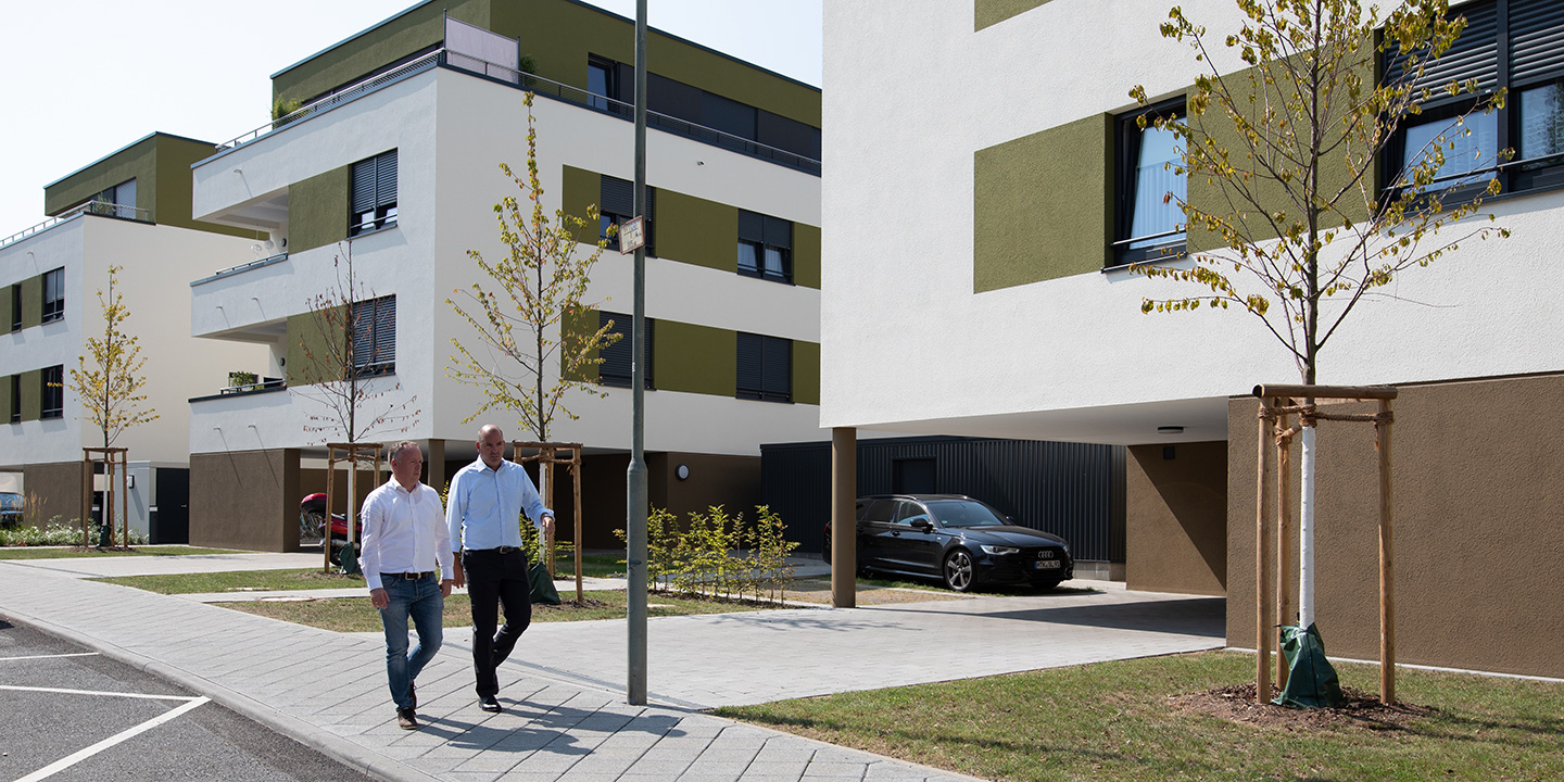 Ein grüner Vorgarten erstreckt sich vor einem modernen Neubau. Was von außen wie ein gewöhnliches Mehrfamilienhaus aussieht, erweist sich bei näherer Betrachtung als Smart Building. Spätestens als eine Frau ihr E-Auto an die Ladesäule anschließt und ein Mann sein Handy zückt, um die Haustüre zu öffnen, wird klar, dass hinter der grün-weißen Fassade wesentlich mehr steckt, als man ahnt.