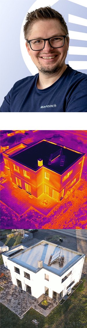 „Gerade bei älteren Gebäuden sind häufig keine, veraltete oder nur unvollständige Pläne und Informationen vorhanden. Oft wurde ohne Dokumentation um- oder angebaut. Durch die intelligente Verknüpfung einzelner Fotodaten und Punktewolken können wir den aktuellen Status des Gebäudes digital nachbilden. Mit diesem „Digital Twin“ kann man in vielerlei Hinsicht arbeiten: So können u.a. die exakten Maße der Dach- und Fassadenflächen berechnet werden, um z.B. die Energieeffizienz des Gebäudes zu ermitteln, und Leckagen wie Wärmebrücken werden über sogenannte Thermo-Scans sichtbar gemacht. Mit Dienstleistern können so beispielsweise Reparaturen oder Wartungsarbeiten besprochen werden, ohne sich gemeinsam vor Ort zu treffen.