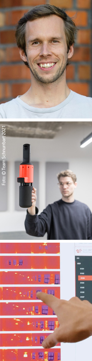 „Bei unseren patentierten Scans werden in kürzester Zeit unterschiedliche Daten erfasst, z.B. auch Infrarot-Daten, Lufteigenschaften und die Feuchtigkeitsverteilung im Raum. Das sind wichtige Kennzahlen für die Überprüfung der Wärmedämmung oder zur Ortung von Leckagen. Mit der Möglichkeit, diese Daten in einem digitalen Zwilling des Gebäudeinneren exakt abzubilden, senken wir die Hürde für Energieeffizienz-Analysen im Immobiliensektor. Wir versetzen Eigentümer und Verwalter in die Lage, die Energieeffizienz ihrer Gebäude überhaupt erst einmal darzustellen, zu analysieren und dann entsprechende Sanierungsmaßnahmen zur Effizienzsteigerung zu planen. Bisher war dafür eine komplizierte, zeitaufwändige und kostspielige manuelle Energieberatung erforderlich, die Eigentümer oft davon abhielt, energieeffizient zu sanieren.