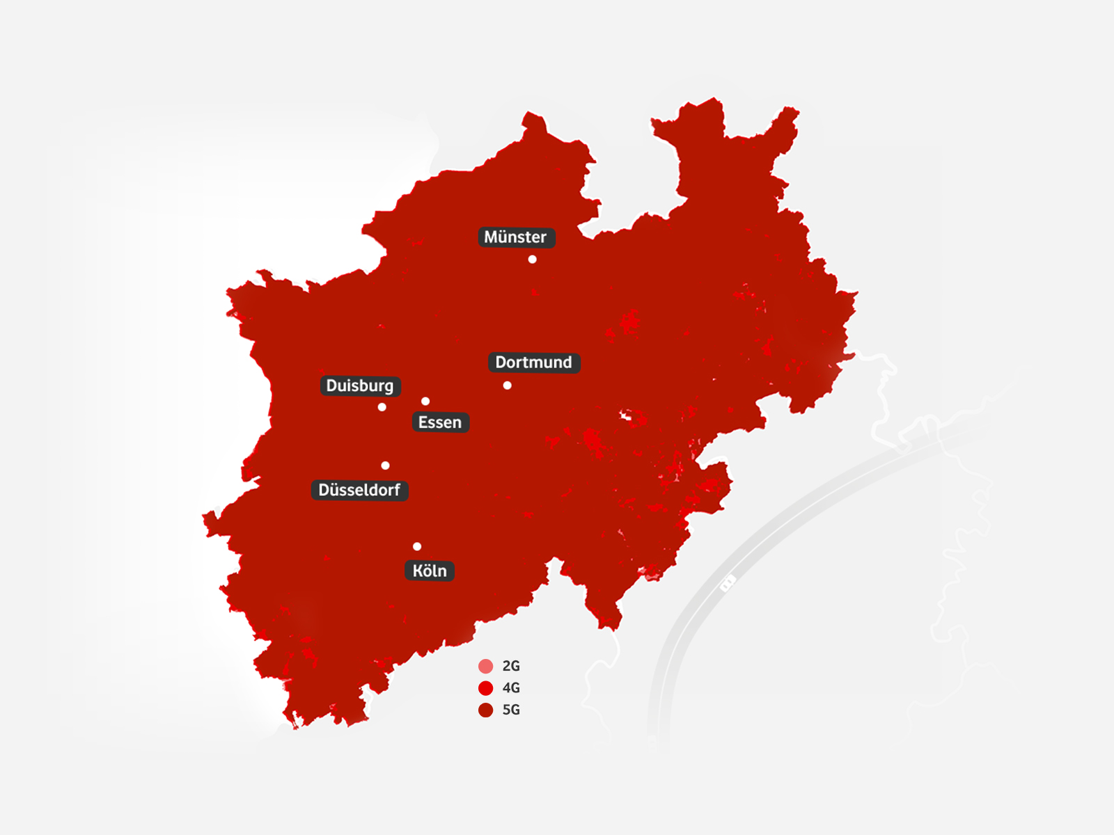 99,68 % aller Haushalte in Nordrhein-Westfalen sind mit dem schnellen Breitband-Internet via LTE oder 5G versorgt. 99,0 % ihrer Zeit bewegen sich Vodafone-Kunden im schnellen LTE- oder 5G-Netz.